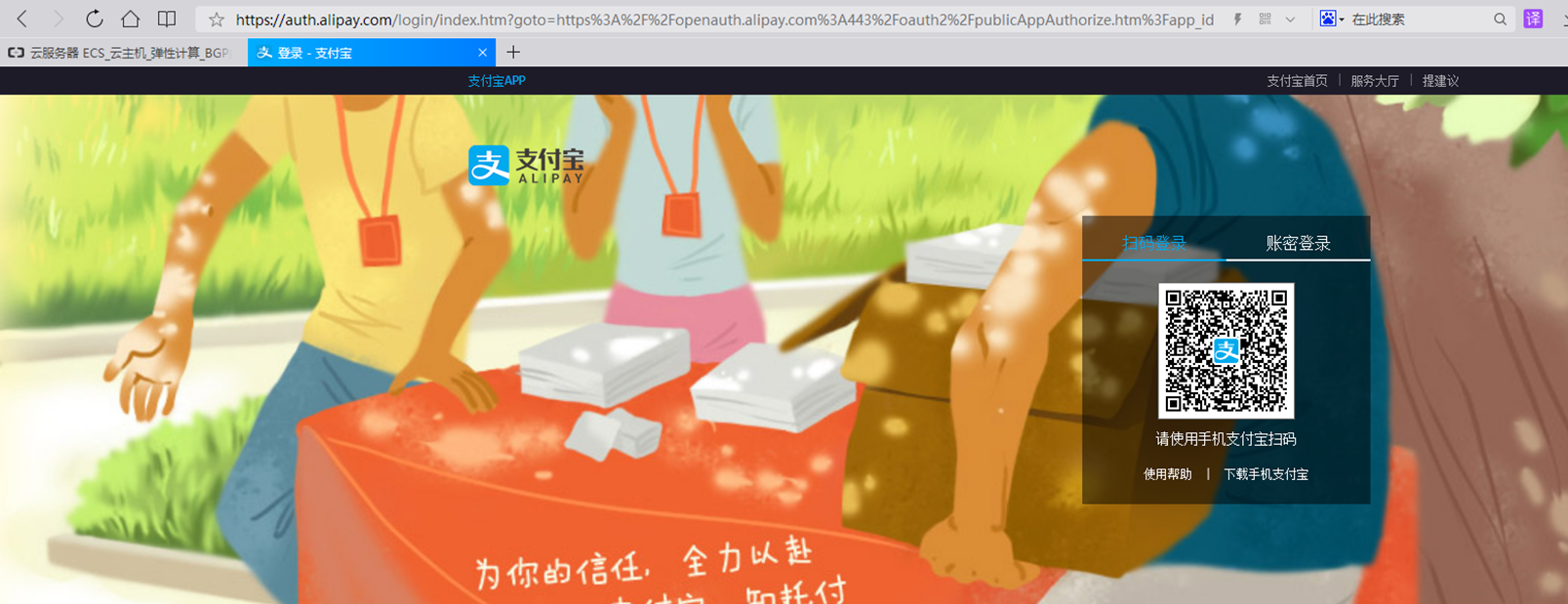 1、網頁進入阿里云https://www.aliyun.com/ 點擊登陸,根據個人習慣選擇登陸方式,本案例使用支付寶。
