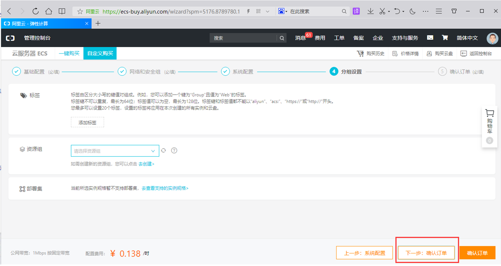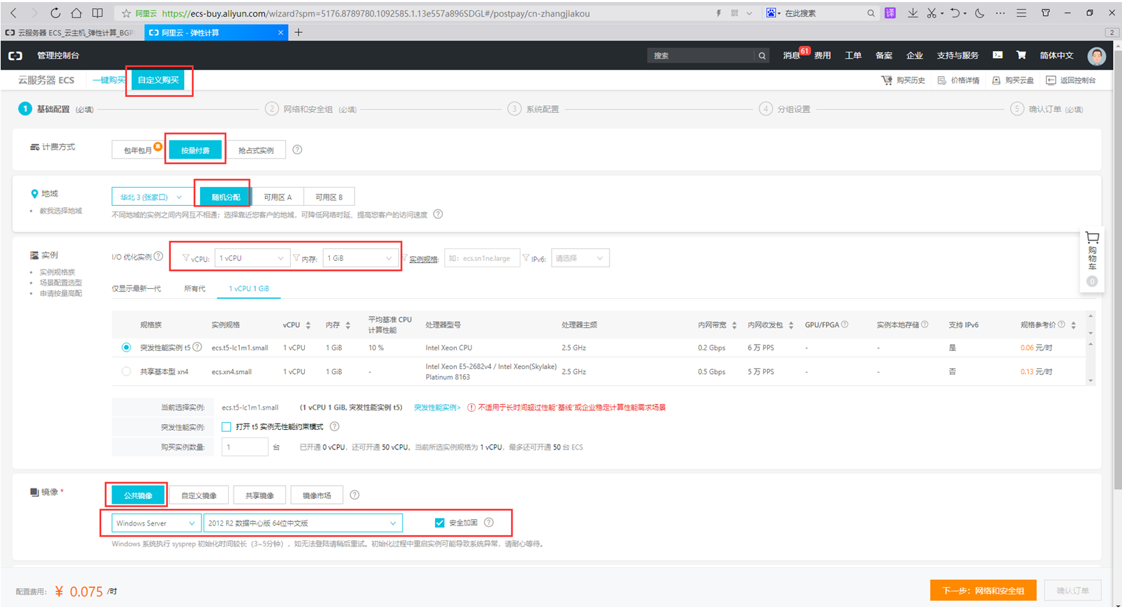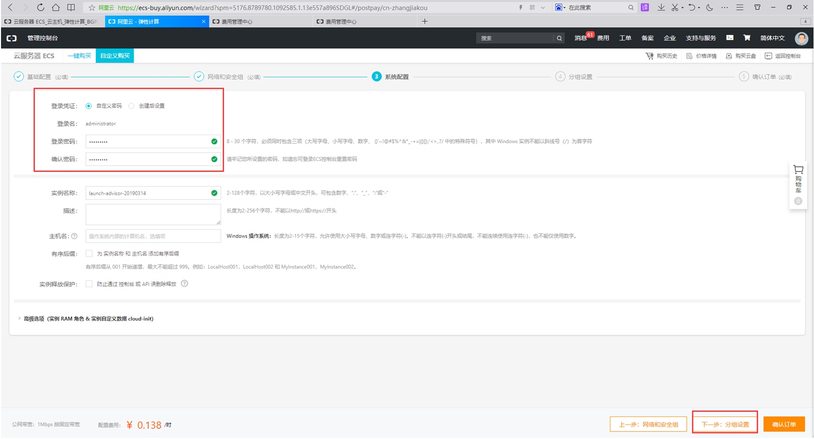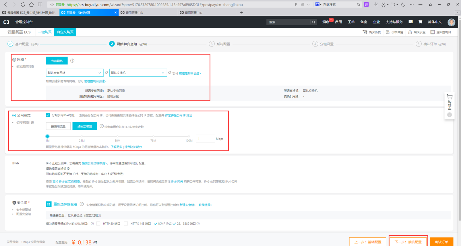 5、配置網絡和安全組,根據需求配置,點擊下一步系統配置。本案例配置:
