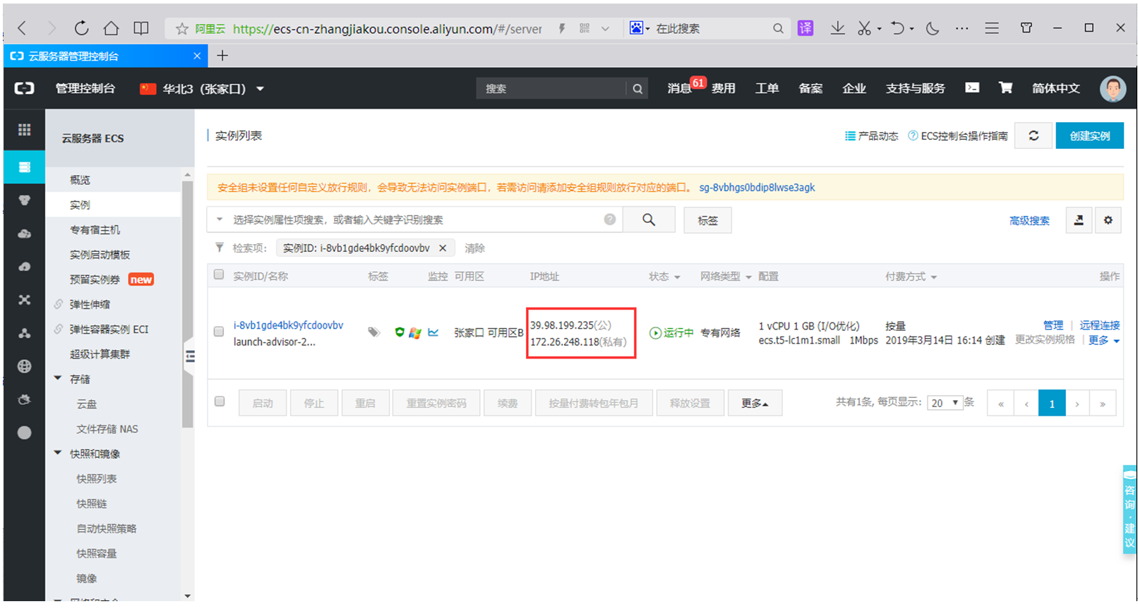 10、至此服務器創建成功,可以看到服務器公網IP為393893199.235,私有IP(內網)為172.26.248.118。
