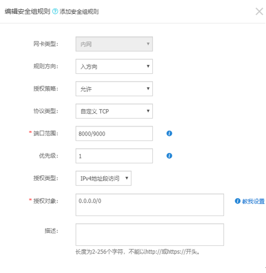 11、在控制臺里添加安全組規則,設置好支持哪些端口訪問,8000/9000表示8000~9000端口可以 訪問。