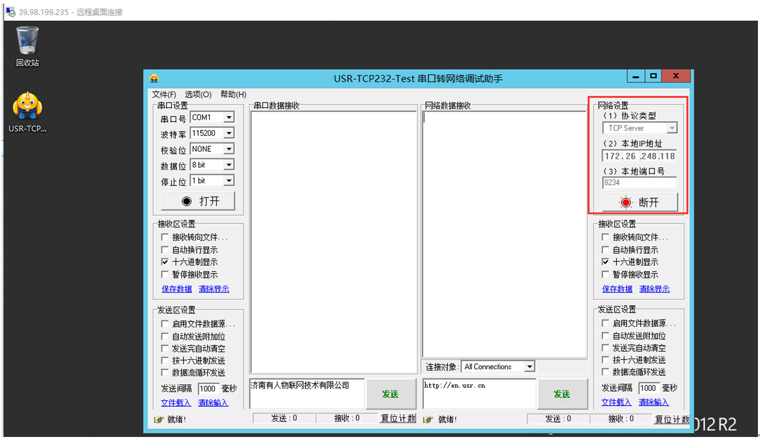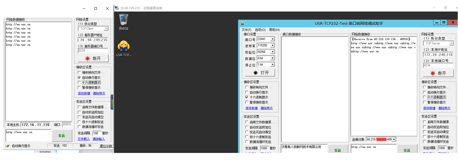 7. 電腦或有人設備,確保可以上網的前提下,設置模式為TCP Client 目標IP:39.98.199.235目標端口:8234,即可和服務器通信,本案例以電腦的調試助手為例。