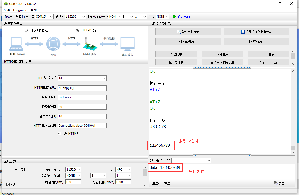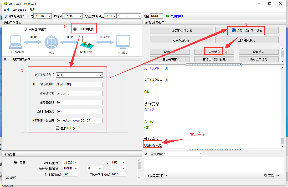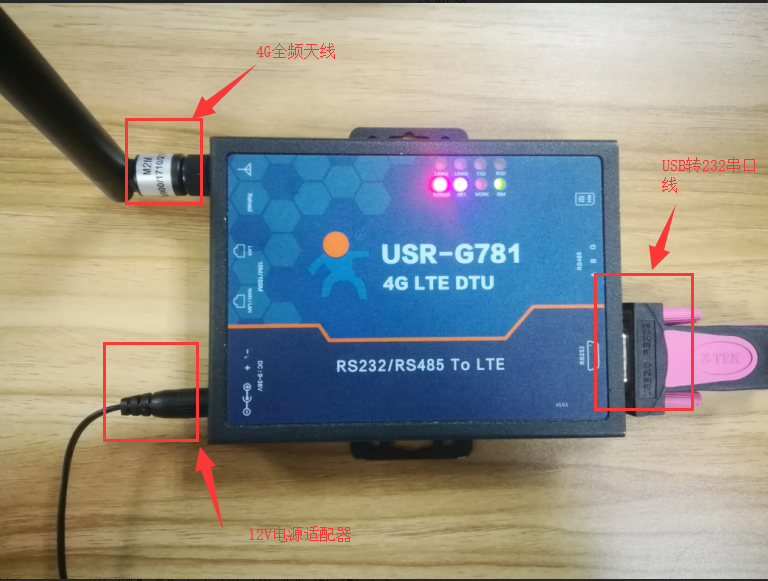 (1) 硬件連接:裝上sim卡,接上天線,G781的串口通過USB轉RS232/485接到PC上,用我司提供的12V電源適配器供電。