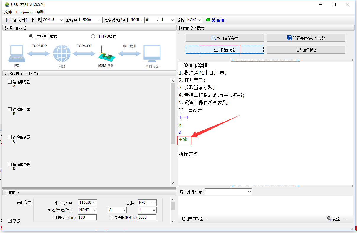 (4)打開串口后,先點擊進入配置狀態,如果模塊能返回+ok的字符,說明電腦和模塊連接是沒有問題的;然后點擊進入通訊狀態,做數據通訊測試。如果不返回+OK的話,請參考(步驟4)