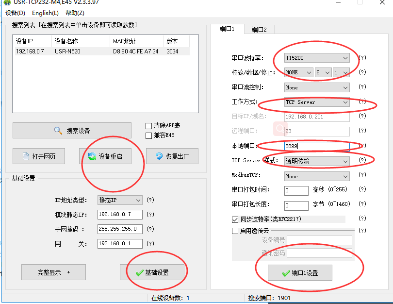 1. 設(shè)置N520 (第一臺(tái))的參數(shù):打開設(shè)置軟件USR-TCP232-M4-setup-V2.3.3.97,設(shè)置他的工作方式為TCP sever,設(shè)置本地端口號(hào)為8899. 然后點(diǎn)擊“端口1設(shè)置”,再點(diǎn)擊“設(shè)備重啟”。如圖所示:
