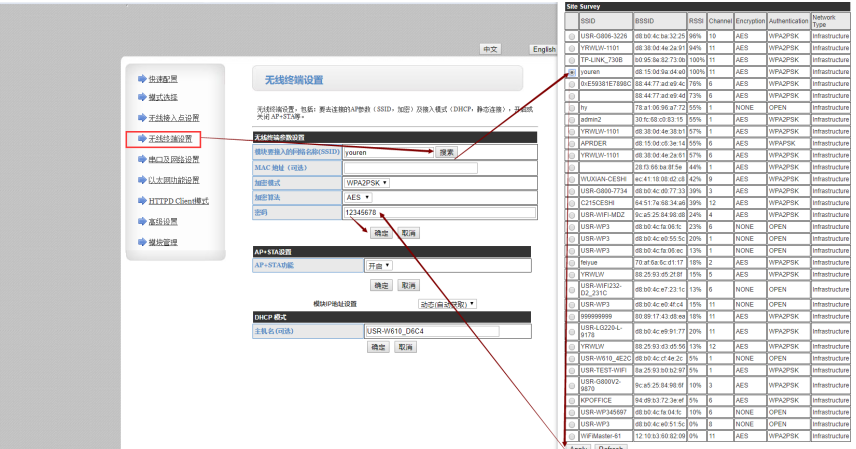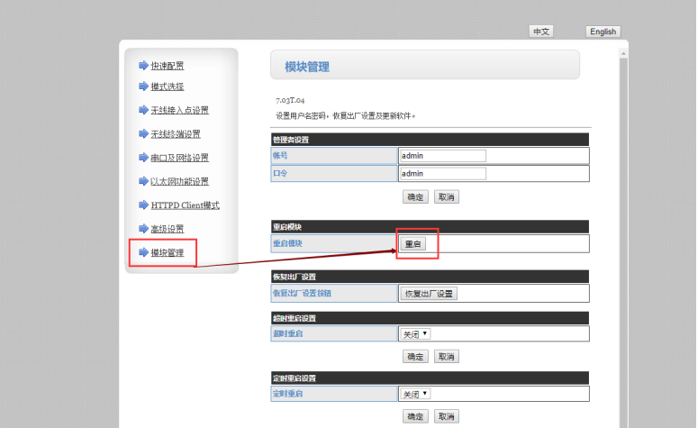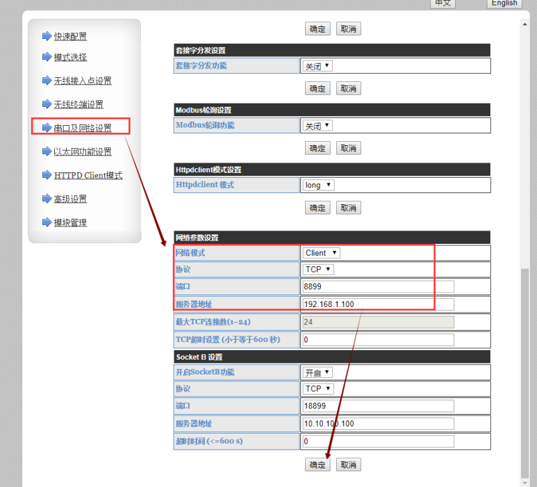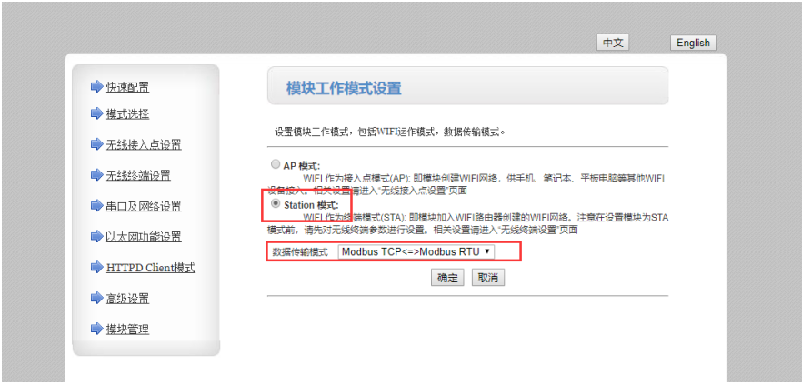 1、模式選擇,選擇STA工作模式,選擇數(shù)據(jù)傳輸模式為modbus rtu <=>modbus tcp,