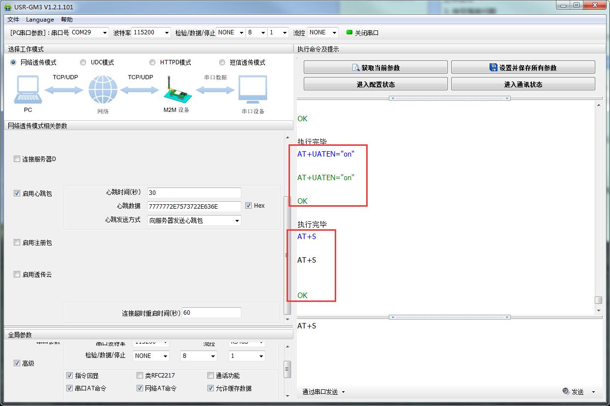 3. 通過AT指令使能串口AT指令,對應的AT指令是AT+UATEN=”on”,然后發送AT+S保存參數,模塊重啟后,既可以使用串口AT指令了