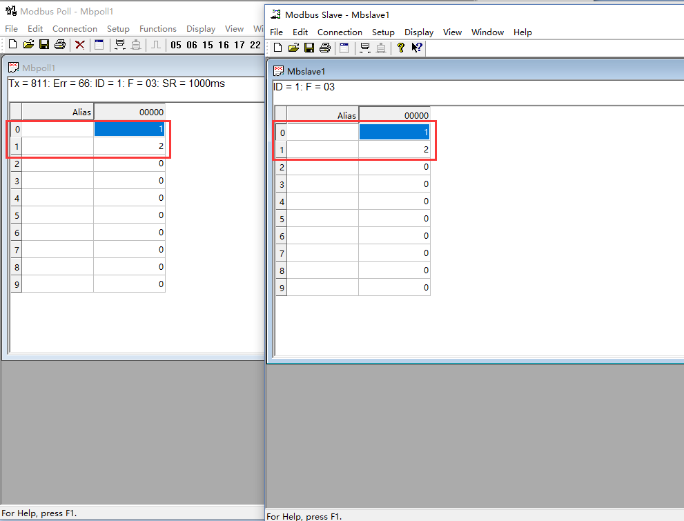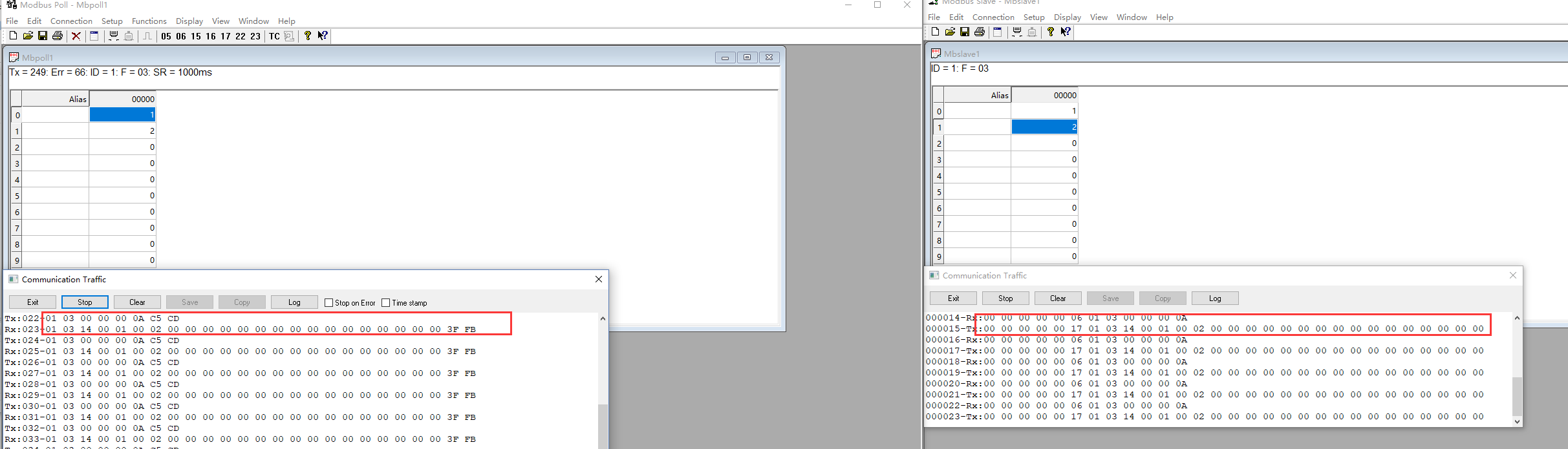(8)數據通信。在Modbus slave軟件中修改對應寄存器的值,在Modbus poll軟件中會對應自動讀取到改變后的值。