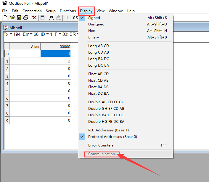 (9)點擊Display---Communication…,打開數據監控界面,可以看到,串口端的modbus RTU格式的數據傳輸到網絡端變成了Modbus TCP格式的