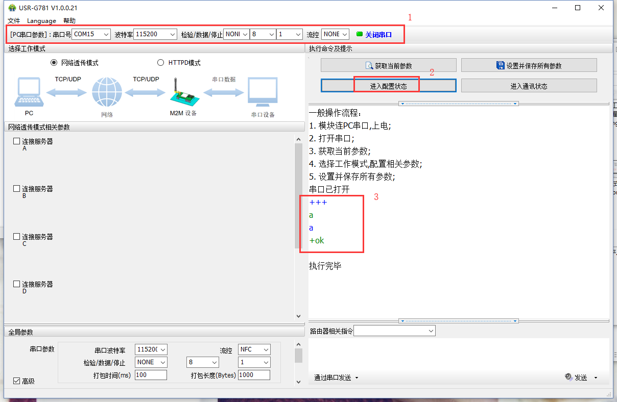 (5)打開串口后,先點擊進入配置狀態,如果模塊能返回+ok的字符,說明電腦和模塊連接是沒有問題的;然后點擊進入通訊狀態,做數據通訊測試。如果不返回+OK的話,請參考(步驟3