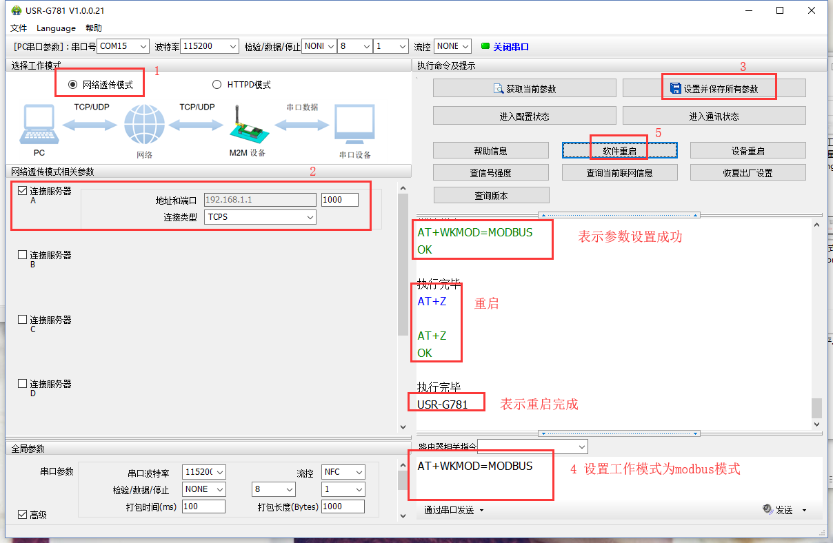 (6)設置參數。設置工作模式為“網絡透傳模式”,勾選鏈接服務器A,設置監聽端口,鏈接類型選擇TCPS,即TCP Server。設置完參數點擊“設置并保存所有參數”,執行完畢后,串口發送AT指令AT+WKMOD=MODBUS,設置工作模式為Modbus模式,指令返回OK后,點擊軟件重啟,待串口打印啟動信息,如“USR-G781”,代表設備重啟完畢。