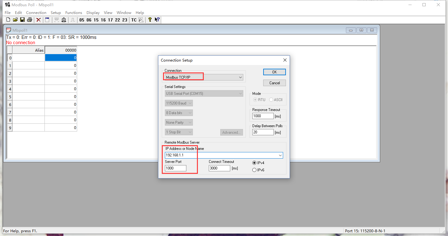 設置Modbus poll,點擊Connection----connect,設置參數如下圖所示,選擇Modbus TCP/IP,填寫對應的服務器的IP192.168.1.1和端口號1000.點擊OK