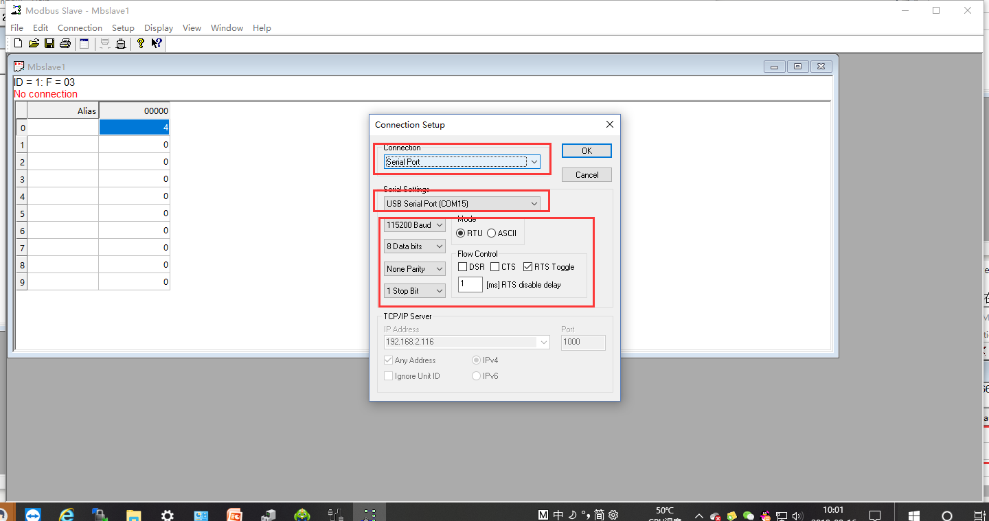 設置modbus slave,點擊Connection----connect,設置參數如下圖所示,選擇對應的串口參數并點擊OK(注意先將設置軟件關閉串口)。