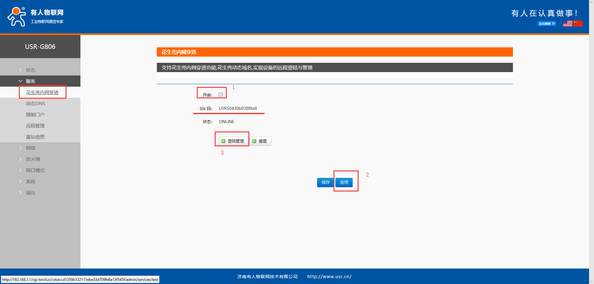 1、  啟用花生殼內網穿透功能。勾選開啟,點擊應用,等待數(shù)秒應用完成后重啟設備,狀態(tài)會顯示ONLINE,即成功開啟