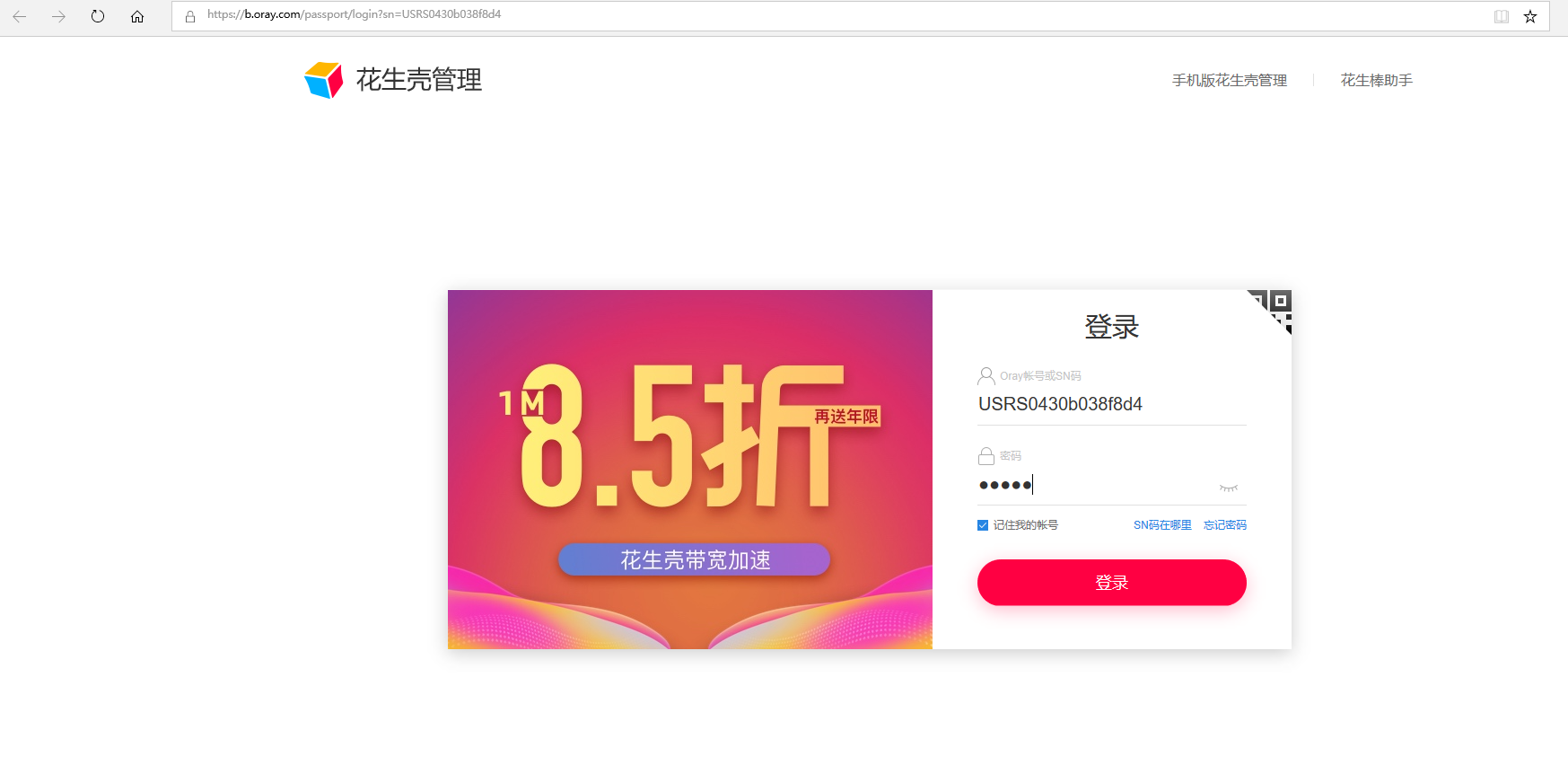 2、點擊登陸管理,頁面跳轉到花生殼登陸頁面,自動識別設備sn,默認密碼admin。點擊登陸。