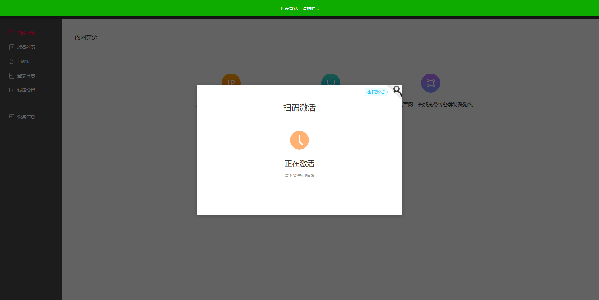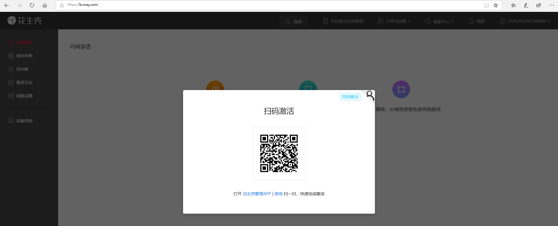 3、進入頁面后顯示掃碼激活。可以用手機花生殼APP掃描二維碼激活或者點擊右上角,切換激活方式。