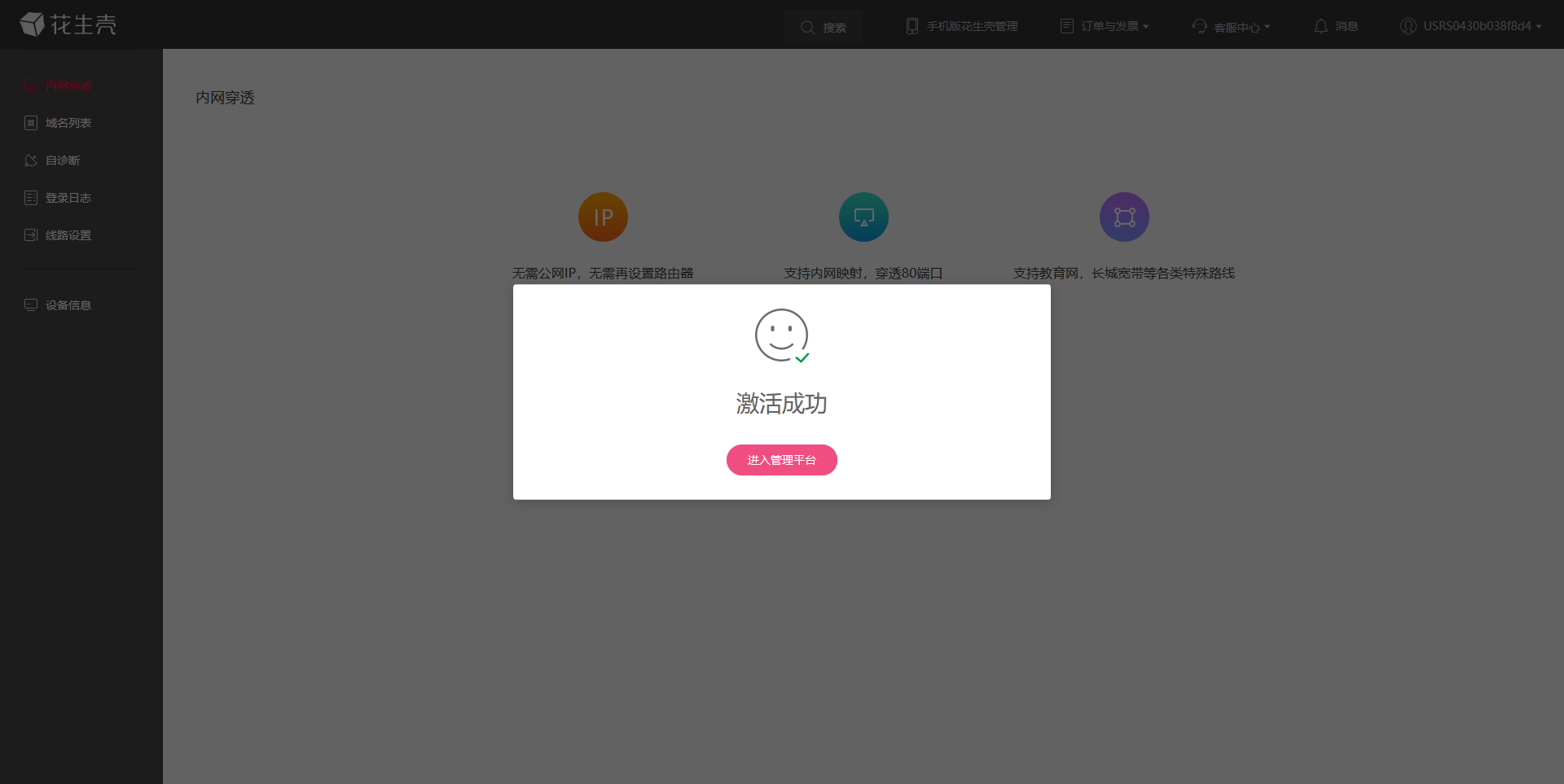手機端確認激活后,顯示激活成功,點擊進入管理平臺。