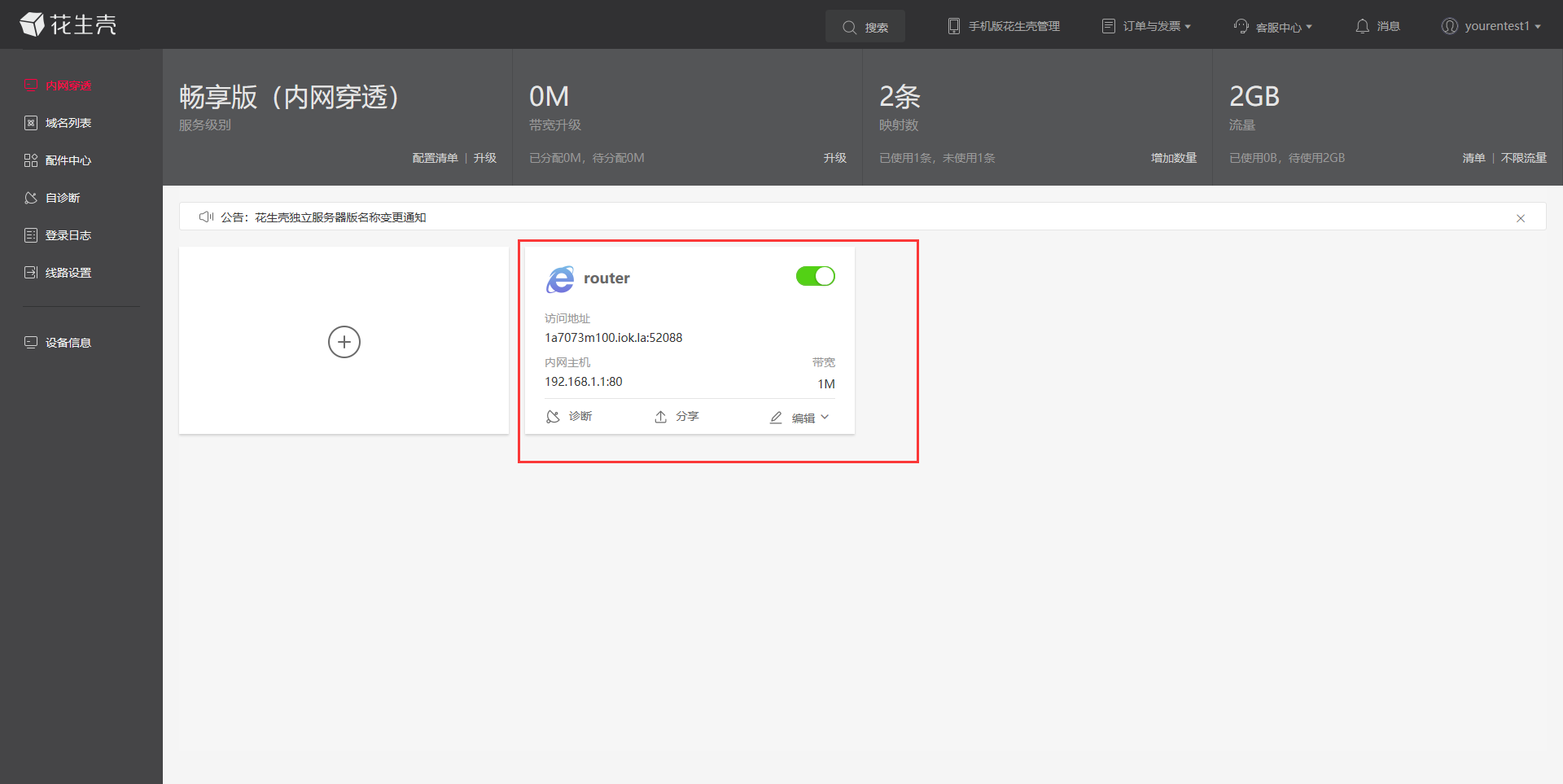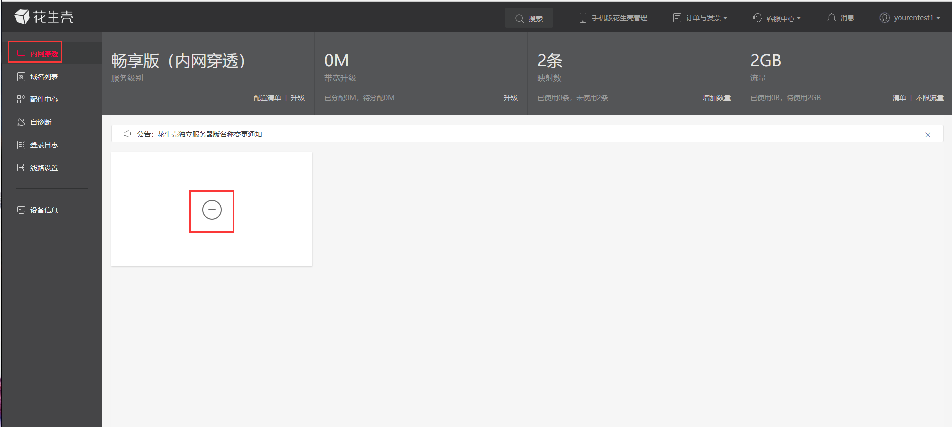 4、左側導航欄點擊進入花生殼內網穿透,點擊頁面上的+,進入配置。(默認免費版本一個賬號可以免費設置兩個內網穿透。)