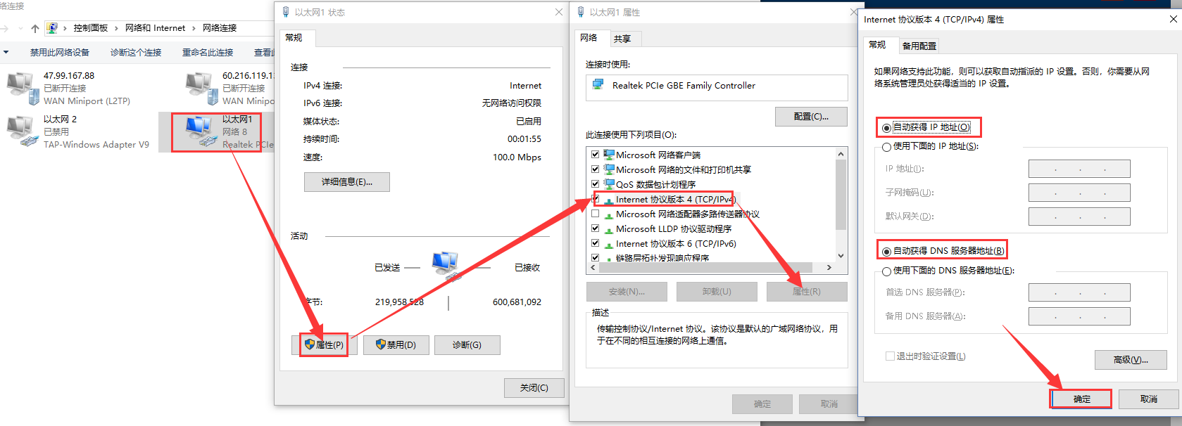 (3)打開網(wǎng)絡(luò)共享中心,雙擊對應(yīng)的網(wǎng)絡(luò)適配器,點(diǎn)擊屬性,選擇IPV4,點(diǎn)擊屬性,修改電腦為自動獲取IP,然后點(diǎn)擊確定。(如果電腦本來就是自動獲取IP,這一步可以跳過)點(diǎn)擊詳細(xì)信息可以查看到電腦獲取的IP地址: