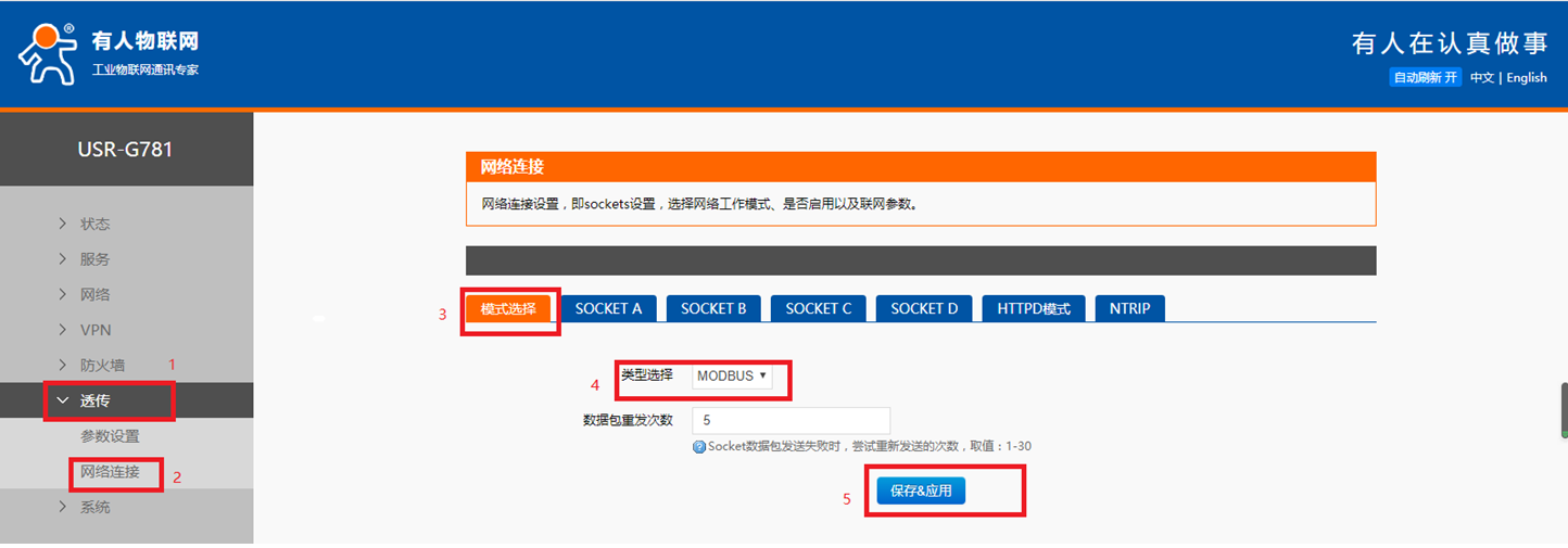 (5)點(diǎn)擊左側(cè)的透傳——>網(wǎng)絡(luò)參數(shù),在頁面中點(diǎn)擊模式選擇,在類型選擇中選擇MODBUS,然后點(diǎn)擊保存。具體操作步驟如下圖紅色數(shù)字所示: