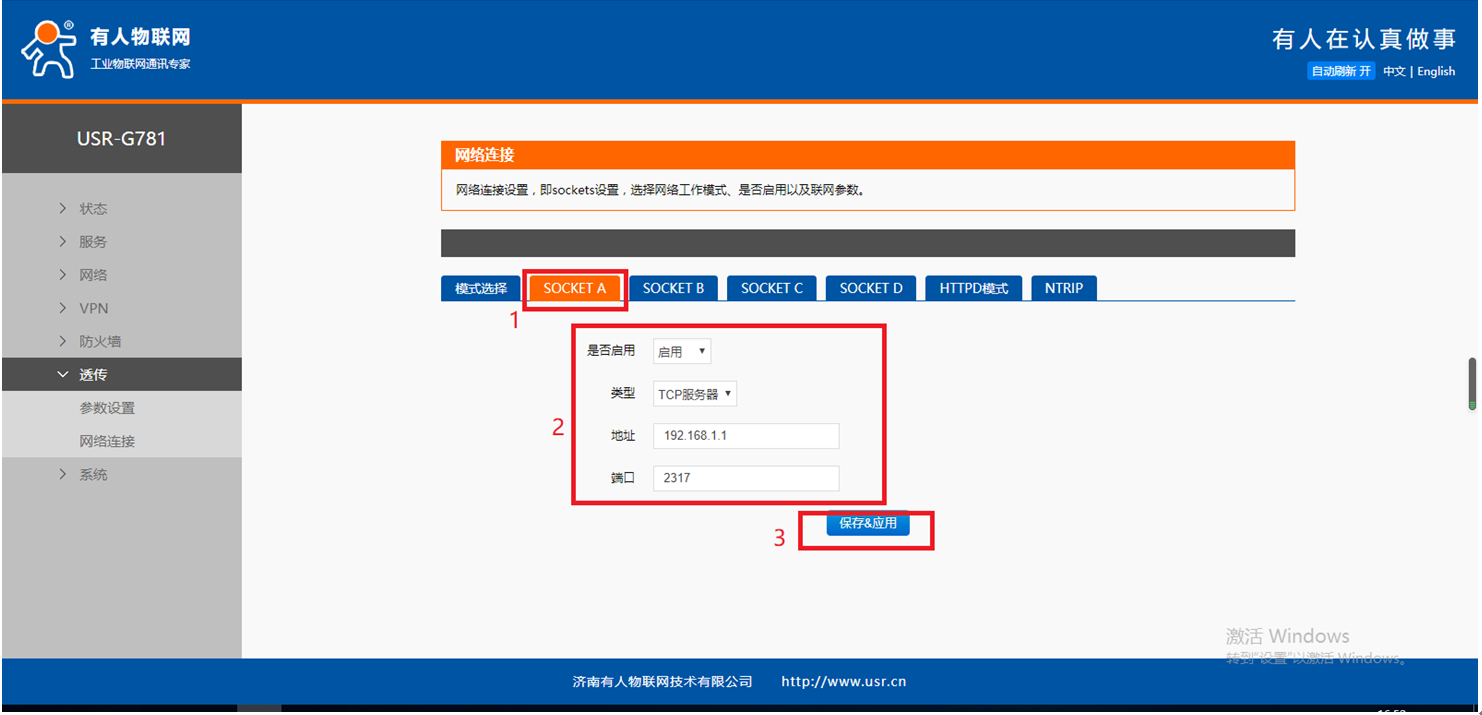 (6)然后點(diǎn)擊SOCKETA按鈕,在相應(yīng)框內(nèi)填入下圖中的信息,若信息相同則不需要修改,填完之后選擇保存。具體操作步驟如下圖紅色數(shù)字所示: