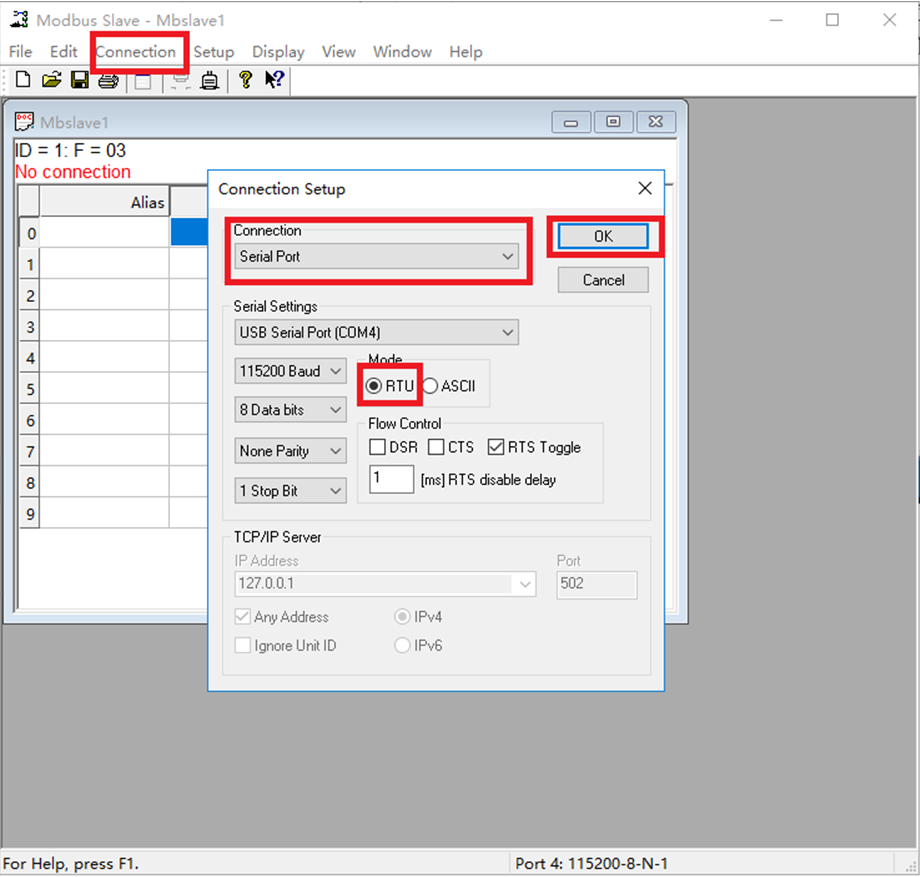 (7)打開modbus slave軟件,點(diǎn)擊Connection按鍵,在菜單中選擇Connect,點(diǎn)擊,出現(xiàn)如下選擇框,按照下圖進(jìn)行選擇。Connection一欄選擇serial port,串口參數(shù)配置成和781的串口參數(shù)相同,mode選擇RTU,然后點(diǎn)擊ok。