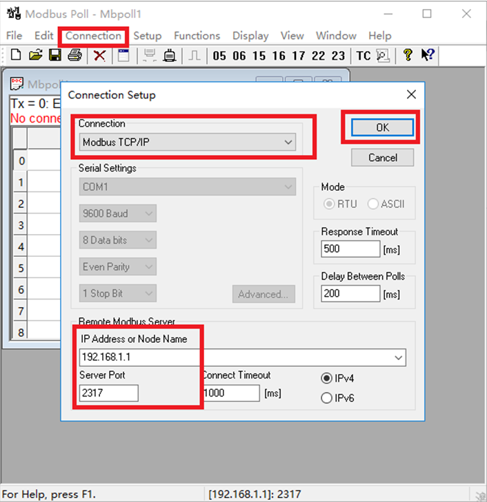 (8)打開modbus poll軟件,點(diǎn)擊Connection按鍵,在選擇框的Connection下選擇Modbus TCP/IP方式,ip地址與端口設(shè)置成和781相同的地址,端口,點(diǎn)擊ok