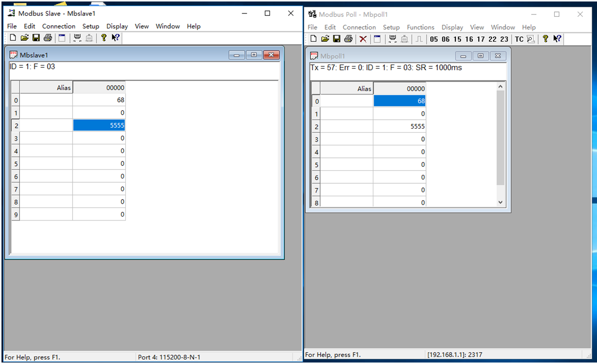 (10)觀察兩個(gè)軟件的數(shù)據(jù),修改slave中的數(shù)據(jù),poll中的相應(yīng)數(shù)據(jù)改變。修改poll中的數(shù)據(jù),slave中的相應(yīng)數(shù)據(jù)改變。通信成功