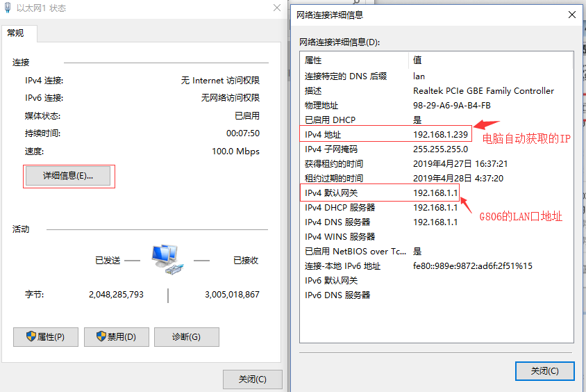 2、雙擊該網卡,顯示詳細信息,查看電腦獲取的IP