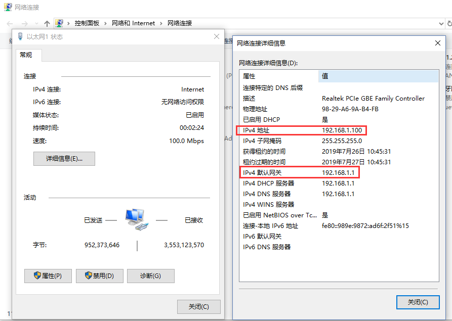 電腦獲取的IP為192.168.1.100,網關地址為:192.168.1.1即G805的LAN口IP
