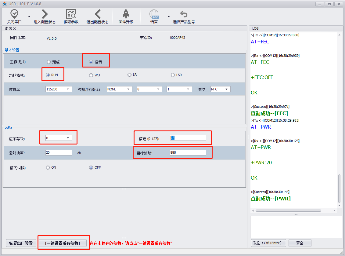 打開LoRa設(shè)置軟件(產(chǎn)品型號選擇L101-P),依次點(diǎn)擊打開串口(選擇A、B對應(yīng)的串口號,串口參數(shù):115200,None,8,1,NFC)、進(jìn)入配置狀態(tài)、讀取參數(shù)、配置參數(shù)、一鍵設(shè)置所有參數(shù),關(guān)閉LoRa設(shè)置軟件。