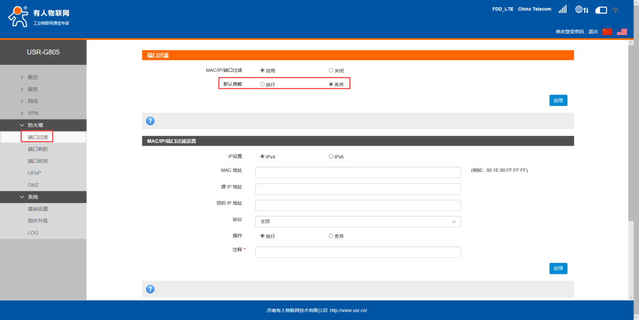 2、防火墻---端口過濾,MAC/IP/端口過濾選擇“啟用”,默認策略選擇“丟棄”。點擊“應用”。