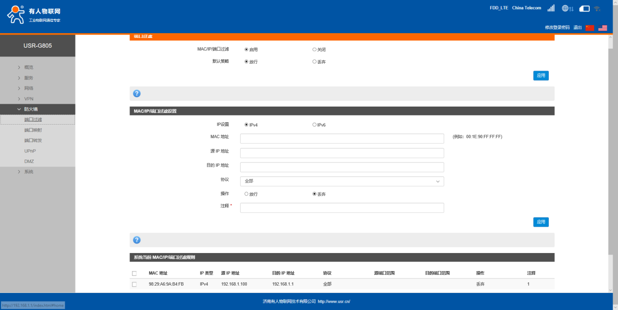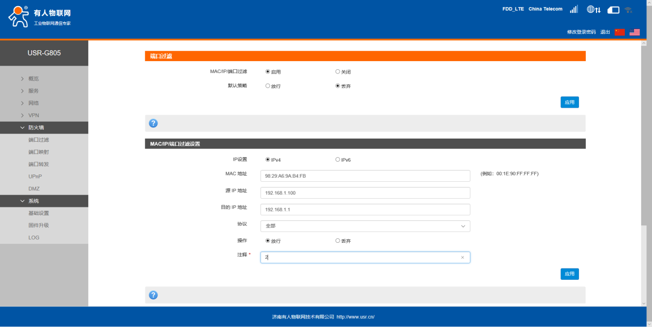 填寫PC的MAC、IP,目的IP填寫G805的LAN口IP,協議選擇全部,操作選擇“放行”。設置完成后點擊應用。