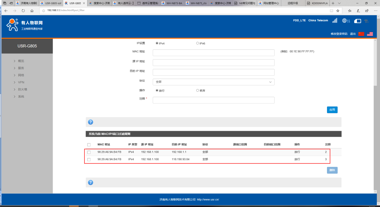 7、按照軟件設計手冊中的端口過濾的說明,添加后PC仍然可以ping通并訪問G805