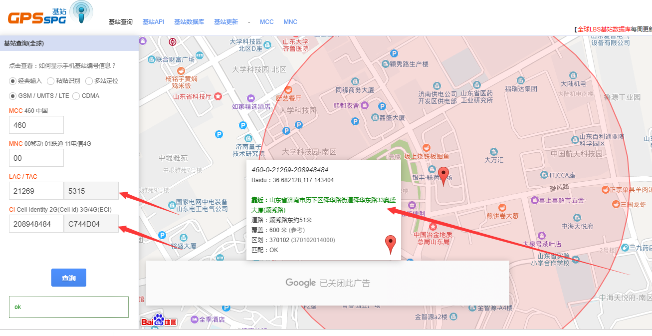 3. 打開網(wǎng)址:http://www.gpsspg.com/bs.htm,在LAC/TAC框內(nèi)鍵入5315,在下面的框內(nèi)鍵入C744D04(0C744D04開頭為0,舍棄),點擊查詢,即可查詢當(dāng)前模塊所在位置