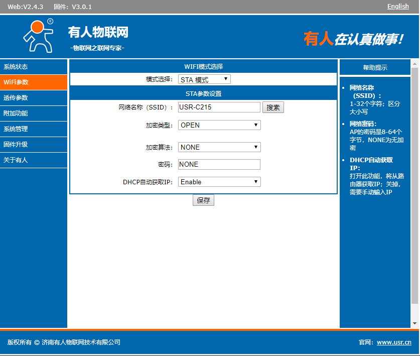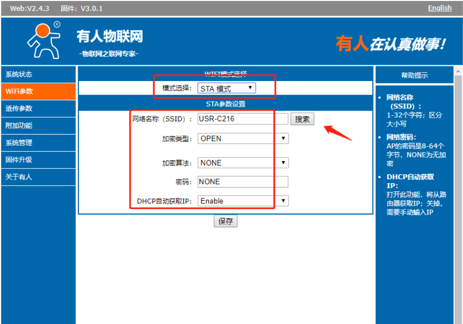 c. 將wifi模式選擇改為 STA模式, 可以填寫或搜索您要連接的AP名稱、密碼等參數。如果需要給模塊設置固定IP,請在下面的“DHCP自動獲取IP”選項改為“Disable”,設置完成后需要點擊保存應用。
