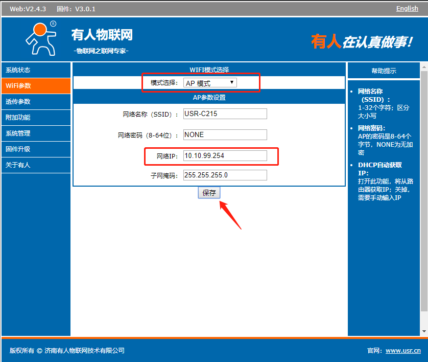 b. 打開瀏覽器,在地址欄輸入 http://10.10.100.254 回車,輸入用戶名:admin 密碼:admin, 模塊B在ap模式下,將網絡ip改為10.10.99.254,點擊保存(防止lan口ip網段沖突)。