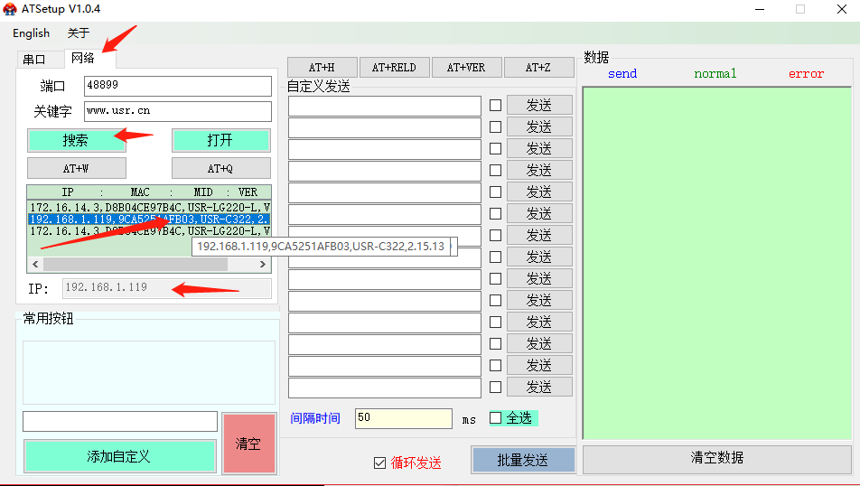5) 也可在此界面發送AT指令進行查詢或配置,發指令無返回時,需要重新點擊“搜索”。