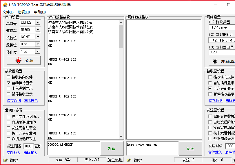 正確打開串口后,點擊“+++a”,接收區(qū)顯示“a+ok”說明模塊進入了命令行模式。