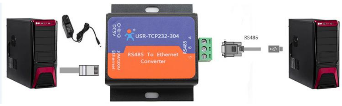 將304接入標(biāo)準(zhǔn)得適配器電源,將304得網(wǎng)口和電腦得網(wǎng)口鏈接起來(lái),通過(guò)USB轉(zhuǎn)485串口線鏈接到電腦上。如圖所示:
