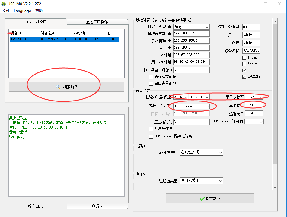 2. 打開(kāi)設(shè)置軟件:USR-M0_V2.2.1.272,點(diǎn)擊“搜索設(shè)備”,搜索到設(shè)備后選中設(shè)備,修改304得參數(shù),串口參數(shù)測(cè)試時(shí)可以默認(rèn)(如果需做改動(dòng),可以直接修改),設(shè)置“模塊工作方式”為“TCP Sever”,“本地端口”設(shè)置為“1234”,然后點(diǎn)擊“保存參數(shù)”。