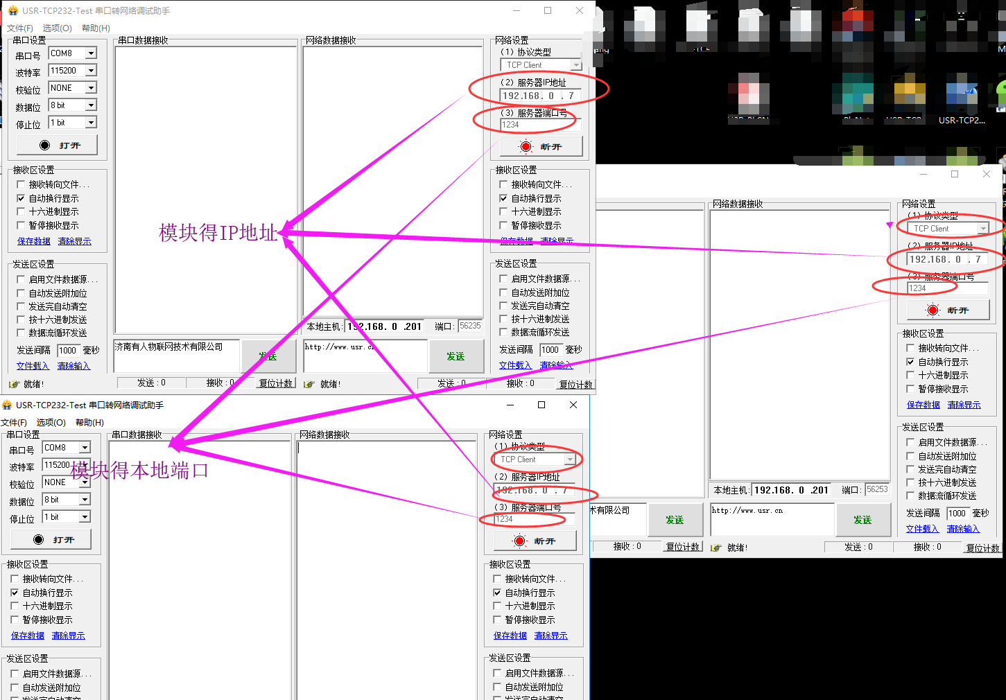 4. 打開(kāi)3個(gè)測(cè)試軟件:USR-TCP232-Test-V1.3,分別與我們得模塊建立socket鏈接,如圖所示: