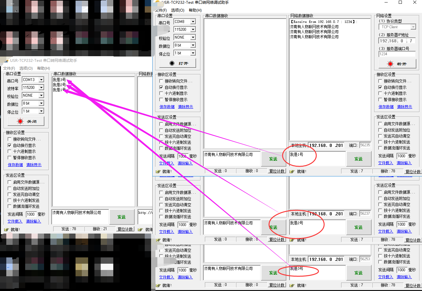 5. 從COM口發(fā)送數(shù)據(jù),三個(gè)測(cè)試軟件(可以理解為3臺(tái)電腦都可以收到數(shù)據(jù))