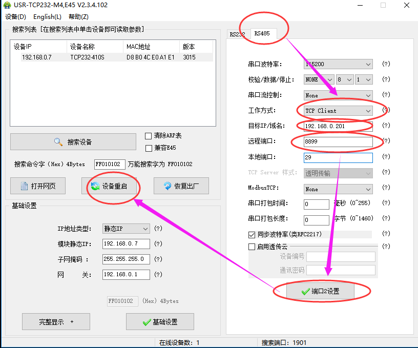 2. 打開設置軟件USR-TCP232-M4-setup-V2.3.3.97,選擇485的串口進行參數的配置,選中完后,設置相關的參數:工作方式設置為“TCP Client”,然后將目標的IP為:“192.168.0.201”然后將遠程端口設置為“8899”.點擊端口一設置,然后點擊設備重啟。