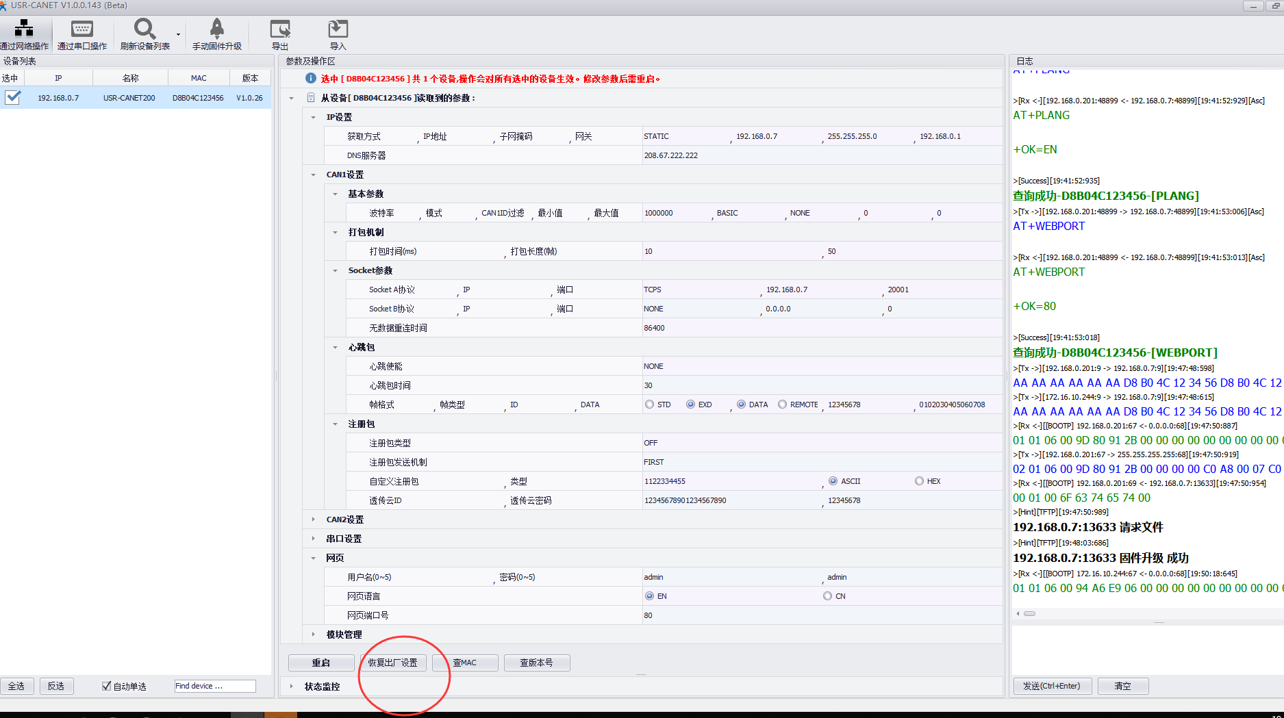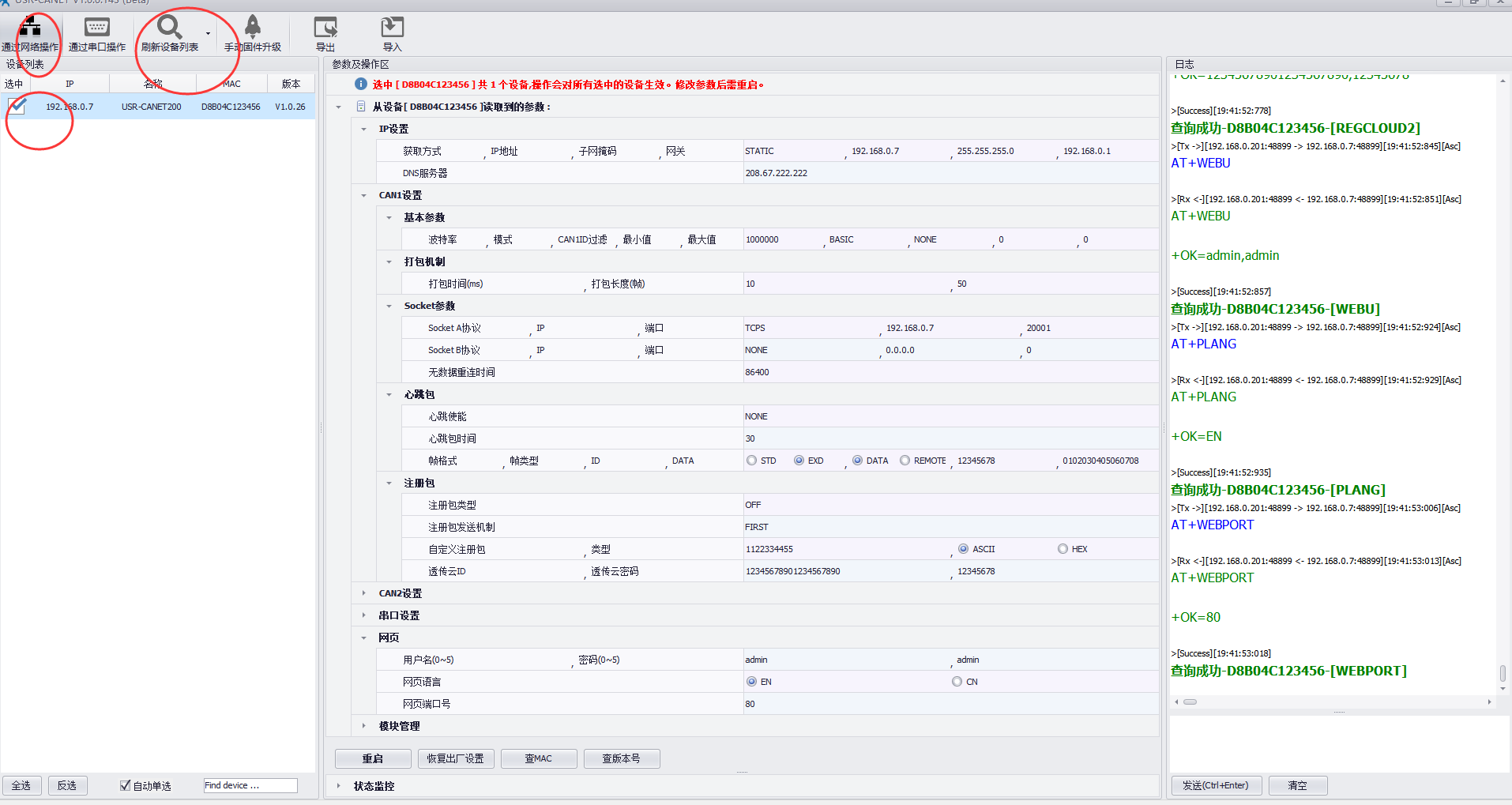 2.打開設置軟件:USR-CANET V1.0.0.143 (Beta),點擊通過“網絡操作”,然后點擊“刷新設備列表”,搜索到設備之后,勾選到相關的設備。設備的參數會刷新。