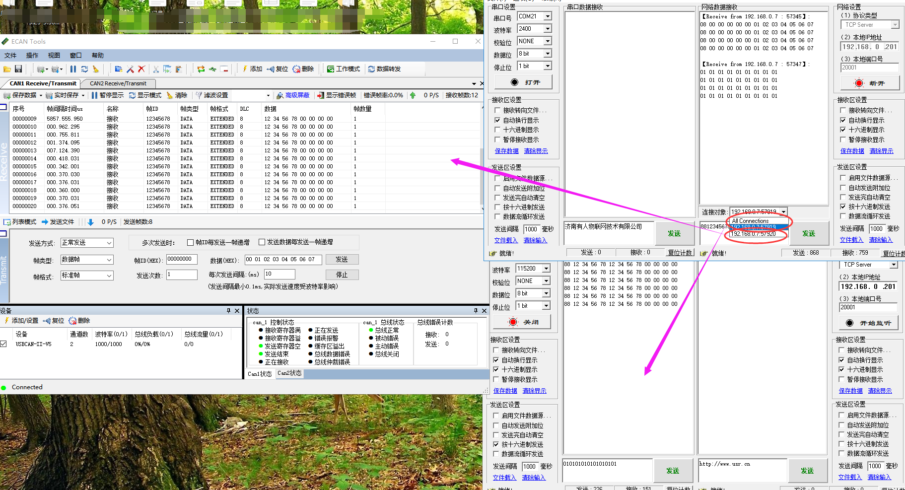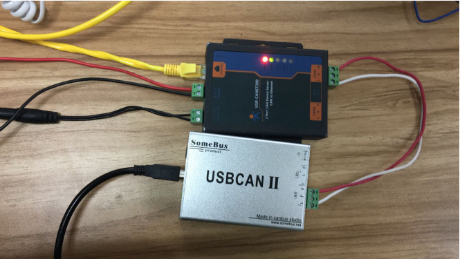 將設備USR-CANET200通過標準的適配器電源將設備上電,網(wǎng)線直連電腦。通過485轉USB串口線將塞設備的485串口和電腦相連接,然后通過Can轉USB串口線,將設備同電腦進行鏈接。