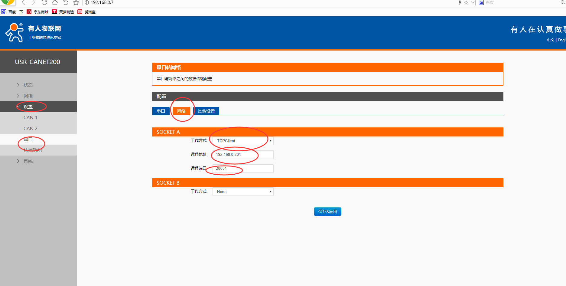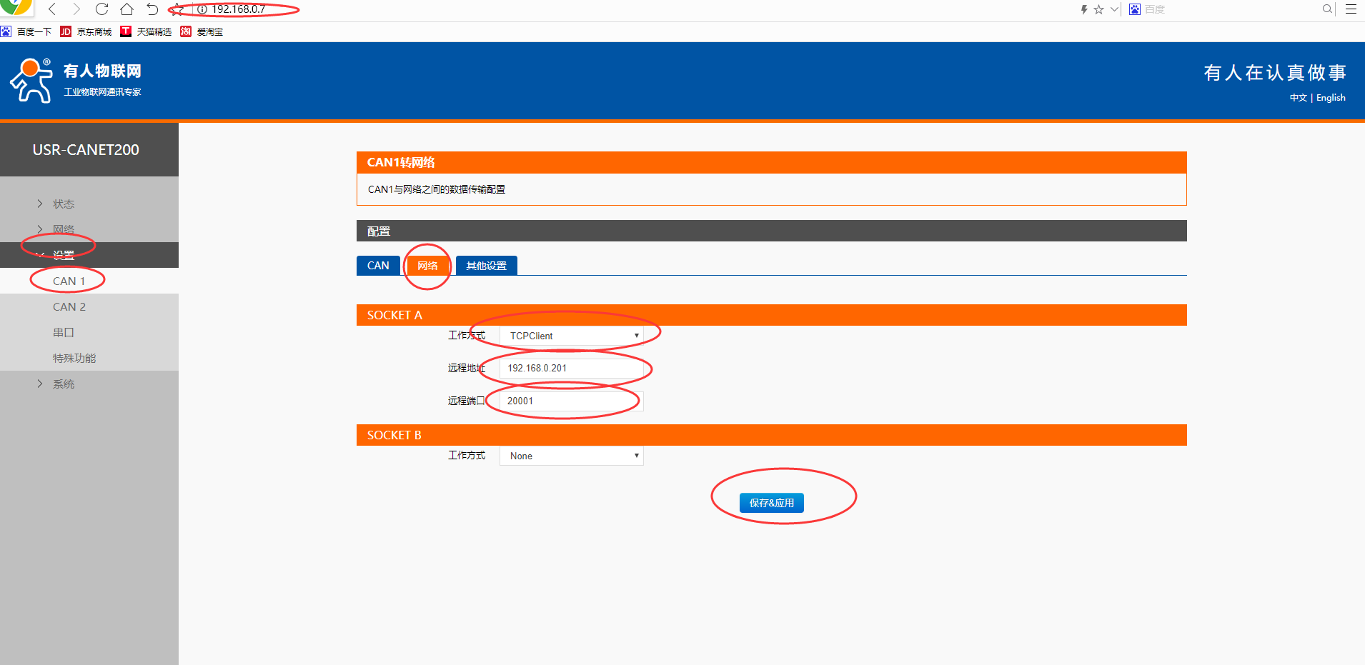 2. 設置Canet200相關的參數(shù):(可以通過設置軟件和內置網(wǎng)頁兩者均可,以下通過內置網(wǎng)頁進行):打開瀏覽器,輸入設備默認的IP地址:192.168.0.7 輸入賬號和密碼(均為admin),點擊設置面的Can1口(以1口為例),點擊網(wǎng)絡參數(shù),設置工作方式為“TCP Client”,然后遠程IP地址為:192.168.0.201(這是直連電腦的IP地址),端口號為“20001”設置完成后點擊保存。