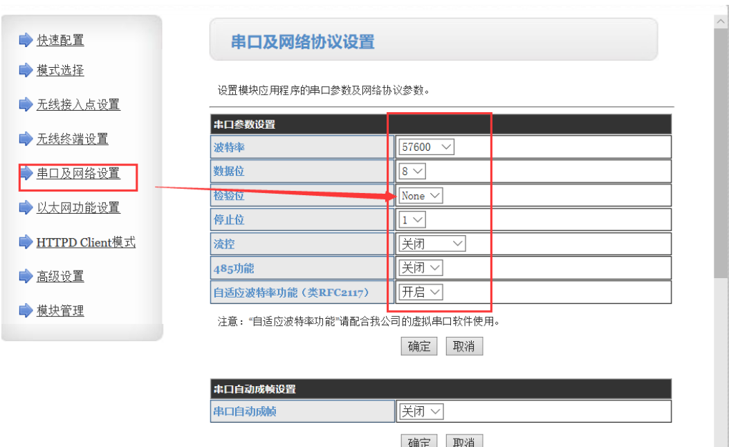 3、點擊串口及網(wǎng)絡(luò)設(shè)置,相應(yīng)設(shè)置如下:(波特率可根據(jù)自己需要設(shè)置) 點擊確定