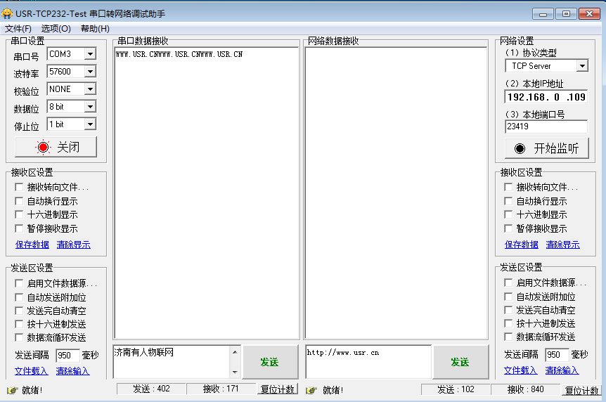 在電腦端的串口助手發送 濟南有人物聯網, 手機端能夠收到數據。