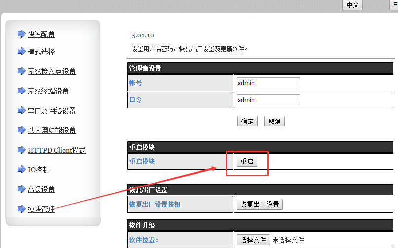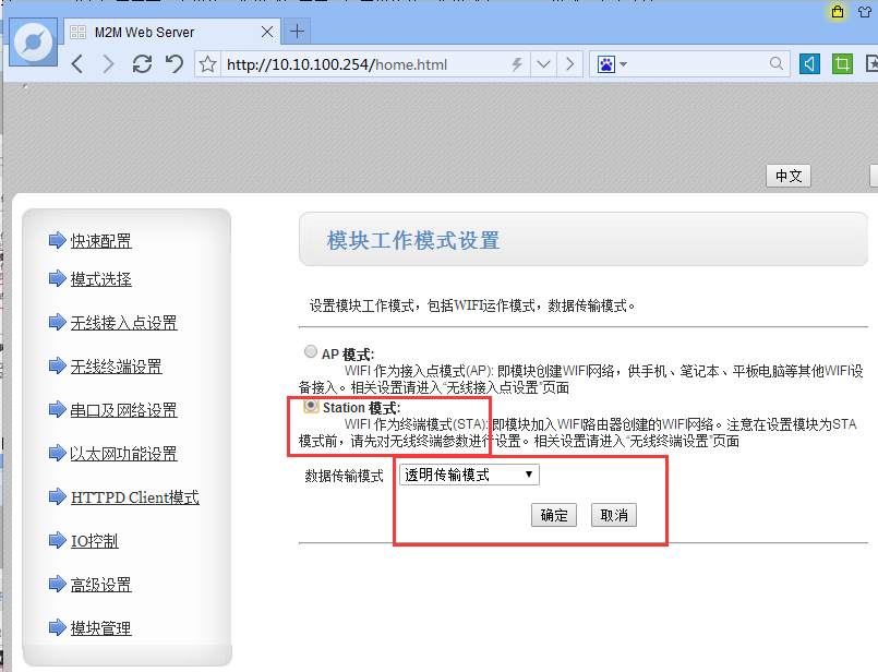 2:在電腦瀏覽器上輸入10.10.100.254.用戶名和密碼都是默認admin。進入設置界面,在模塊工作模式設置里,設置模塊的工作模式為station模式,點擊確認。