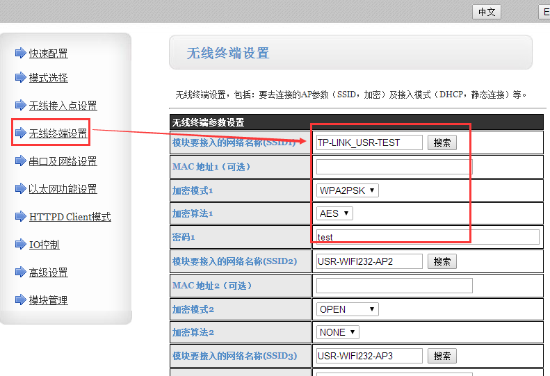 3:設置模塊連入無線路由器。在無線終端設置中,搜索要連的路由器的SSID ,確認后,輸入無線密碼,點擊確認。模塊IP地址設置為靜態IP.